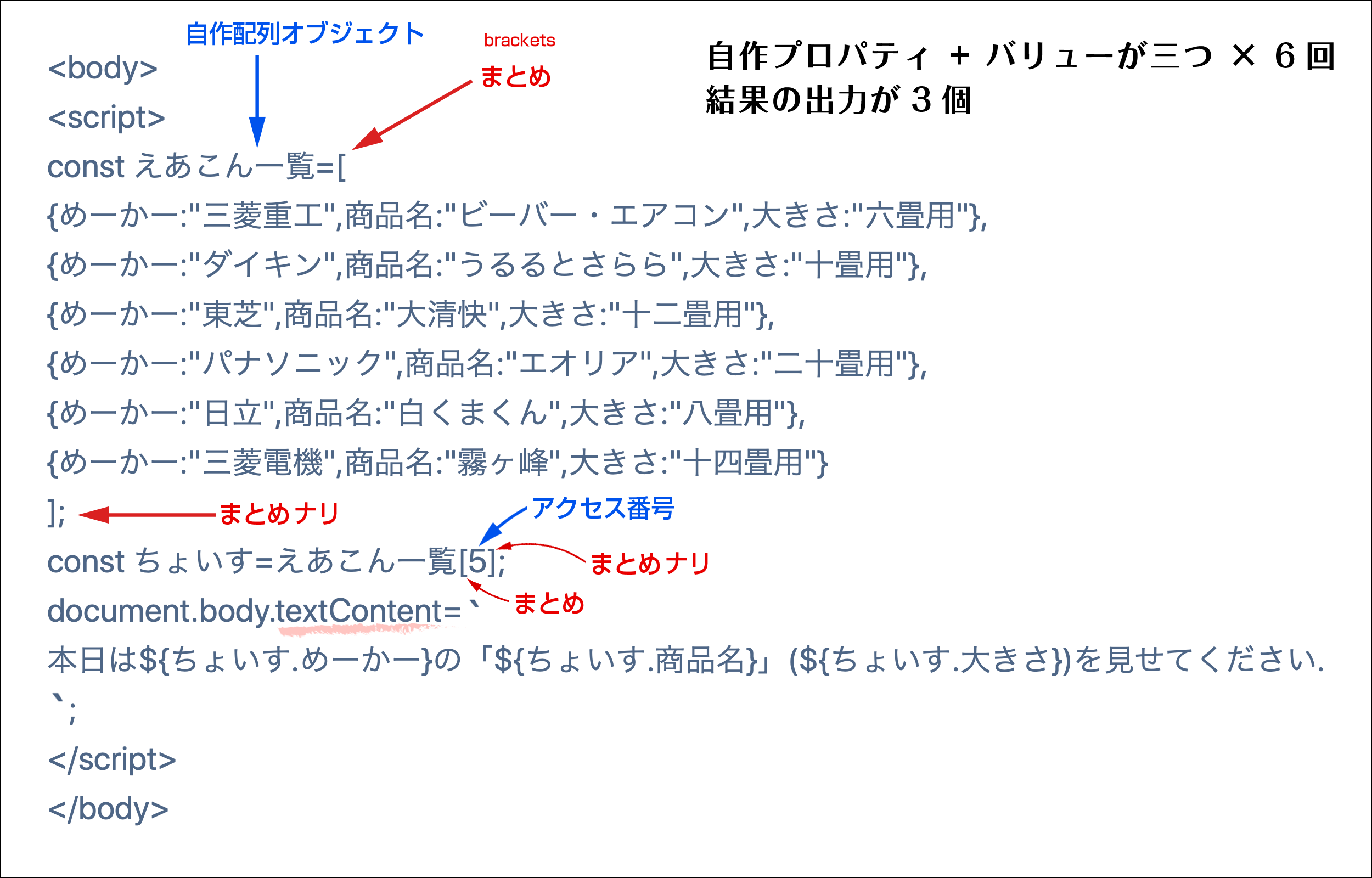 <body> <script> const えあこん={ めーかー:"日立", 商品名:"白くまくん", 大きさ:"八畳用" }; document.body.textContent=` ${えあこん.めーかー}の ${えあこん.商品名}で ${えあこん.大きさ}を購入します. `; </script> </body> この記述を元にして, 書き換える
